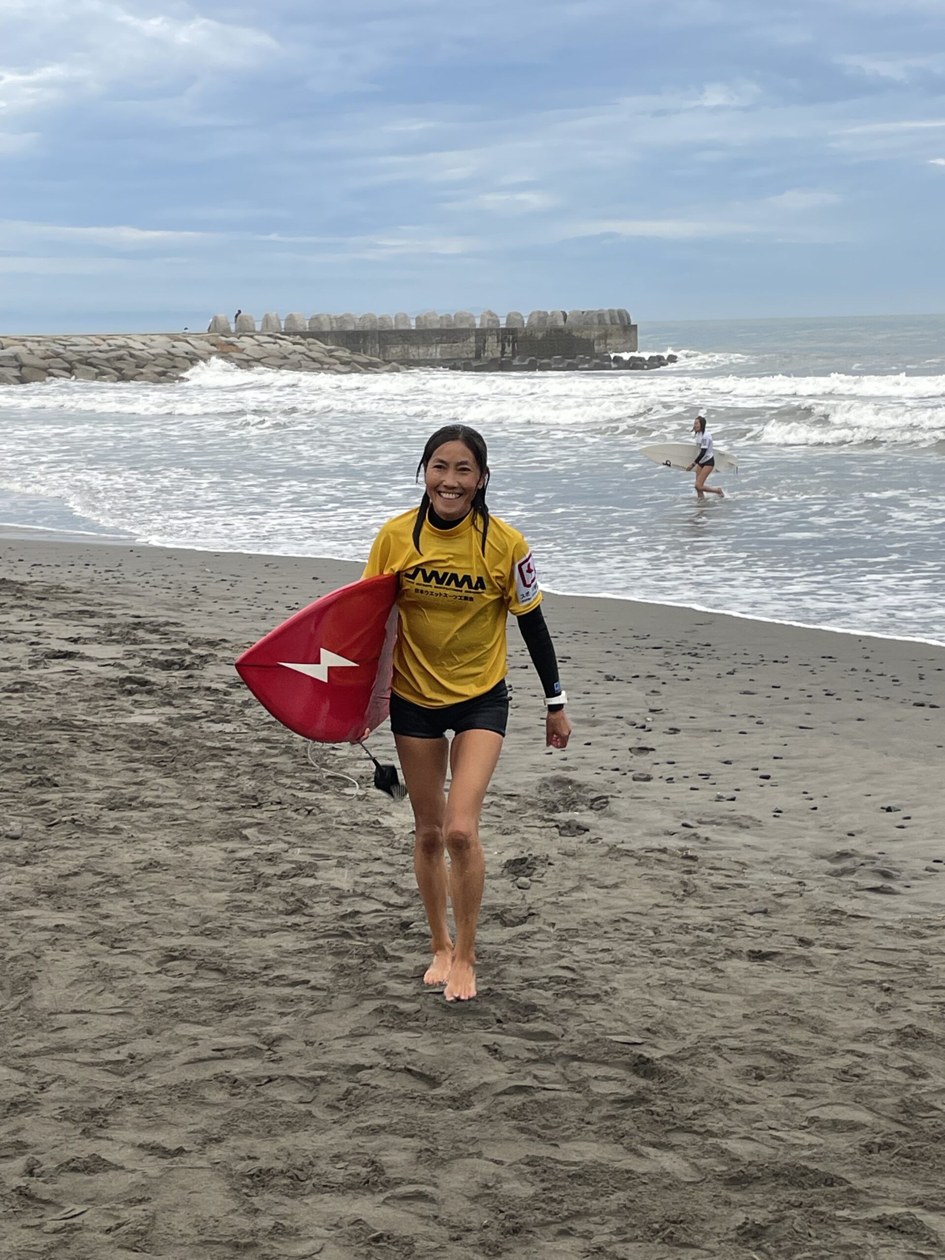 千葉南支部長の大淵。連日4時に起きて1日中、海に。3日目は支部長クラスで出場、大会中1番波のある時で、風も合って、いい波に乗れて、大満足でした。